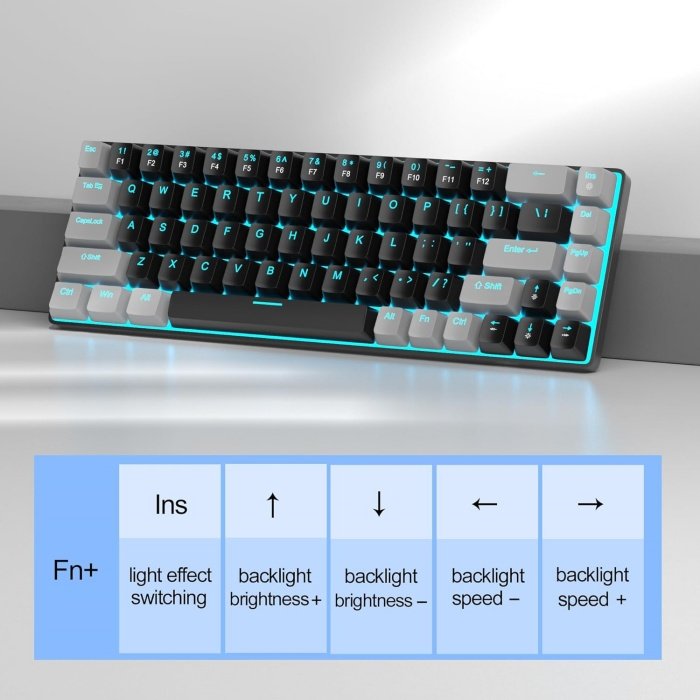 Classic charming blue LED backlit: Customize multiple illuminated LED light effects, supports about 15 backlight modes, press Fn + Ins can control it, FN + ←/→ control backlight speed, and FN + ↑/↓ control backlight brightness.